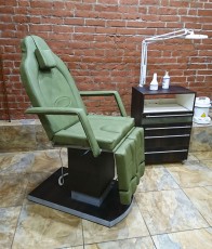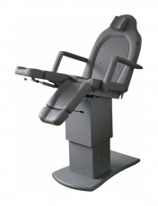 Педикюрное кресло оснащено двумя электромоторами, обеспечивающими регулировку высоты и угла наклона сиденья. Опоры для ног фиксируются при помощи газ-лифтов. Кресло легко раскладывается в горизонтальное положение, образуя ровную поверхность. Надежная конструкция системы подъема обеспечивает высокую устойчивость кресла даже при максимальной высоте. Управляется при помощи ручного проводного пульта. Дополнительно при производстве могут быть установлены различные опции.