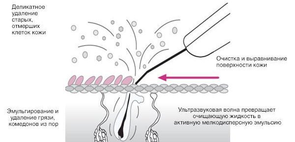 Это технология глубокого и деликатного очищения и удаления ороговевших клеток кожи. Во время воздействия звуковые волны удаляют загрязнения из пор, не растягивают кожу и не доставляют дискомфорта во время процедуры.