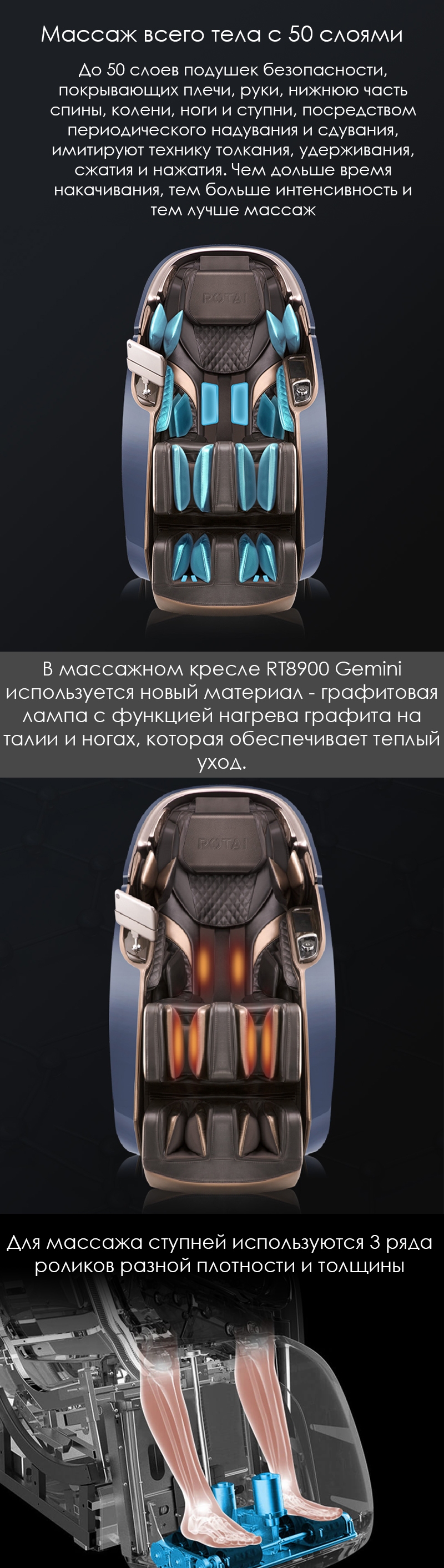 Массажное кресло Xiaomi RoTai Gemini Massage Chair – это лучший способ расслабиться после тяжелого рабочего дня. Для выполнения массажных процедур используется инновационная система из двух 3D SL массажеров. Они установлены на длинный брус с ходом от 116 см до 121 см. Ход движения верхнего механизма составляет 63 см, в центральной части – 30 см, а ход массажера для бедер и талии – 83 см. Благодаря такому решению, массажер может охватить несколько зон одновременно. Несмотря на такую эффективность, немаловажная особенность данного устройства заключается в том, что оно может учитывать изгиб спины и подстраиваться под индивидуальные особенности каждого пользователя.