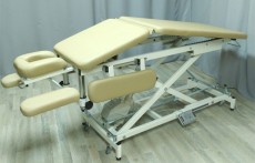 Массажный стол оснащен электроприводом, обеспечивающим плавное перемещение ложа в вертикальной плоскости. Управление осуществляется при помощи ножной педали. Угол наклона секций меняется механически. В лицевой части установлен газовый амортизатор, обеспечивающий мягкое движение при смене положения.