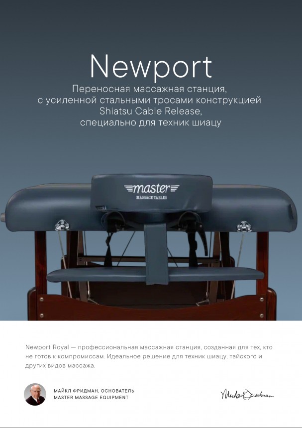 Выведите свои терапевтические процедуры на новый уровень с массажным столом Master Massage Newport с системой быстрого снятия тросов (Cable Release)! Этот широкий стол (76 см) обеспечивает непревзойдённый комфорт и надёжность, позволяя вам оказывать качественные услуги в любых условиях.