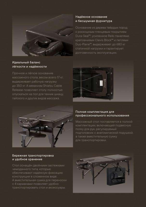 -Вся деревянная конструкция — не содержит формальдегид и канцерогены, соответствует строгим экологическим требованиям штата Калифорния (CARB). -Увеличенное ложе BIG TOP™ — на 26% больше мягкой поверхности благодаря расширенным плечевым зонам. -Прямоугольные углы — обеспечивают более естественную и расслабленную поддержку плеч, согласно анатомическим исследованиям. -Матрас толщиной 7.6 см (3 дюйма) из многослойной пены Small Cell Foam™ — включает слой пены с эффектом памяти (Memory Foam). -Анатомическое лицевое отверстие с заглушкой — удобно для клиента и практично в ограниченном пространстве. -Reiki-панели — усиленные панели под ножками в 2 раза прочнее стандартных, для лучшей устойчивости. -Обивка Italia PU — водо- и маслостойкая, без CFC, усилена джинсовой подкладкой для повышенной износостойкости. -Ножки из твёрдой древесины цвета кофе — покрытие Dura-Seal™ придаёт глянец и защищает от повреждений. -Система Auto-Lock™ — моментальная и надёжная установка стола. -Пронумерованные отверстия — для быстрой и точной регулировки высоты. -Петли DUO-PLANE™ — обеспечивают максимальную прочность по центру стола. -Нескользящие и не пачкающие ножки — безопасны для любого типа напольного покрытия. -Нейлоновые вставки в ножках — исключают скрипы и расшатывание. -Стабилизирующая перекладина — усиливает конструкцию и облегчает складывание. -Крепления Clevis Block™ — гарантируют прочное и надёжное крепление ножек. -Регуляторы высоты QUIK-SET™ — позволяют менять высоту с усилием на 70% меньше, чем у стандартных ручек. -Двойные застёжки чемоданного типа — надёжно фиксируют стол в сложенном положении.