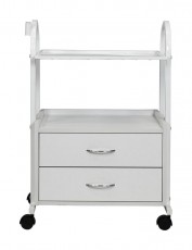 Каркас: две боковины из прочного металла, покрытые влагоотталкивающим покрытием. Полочка: металлическая с бортиками, крепится к боковинам. Тумба: материал – ЛДСП белого цвета, два выдвижных ящика. Колеса: пластиковые, вращающиеся, чёрные. Настоящим помощником мастеру в его рабочем помещении станет косметологическая тележка MDD105. Практичная и надёжная, она создана, чтобы держать нужные инструменты, расходные материалы и мелкую косметологическую аппаратуру в порядке и под рукой. Конструкция косметологической тележки несложная, но весьма функциональная. Во вместительной тумбе с двумя выдвижными ящичками разместятся всё необходимое оборудование, а на верхней полке мастер может разложить принадлежности, использующееся во время рабочего процесса. Бортики на полочке не позволят случайно упасть инструментам на пол. Пространство между полочкой и тумбой можно использовать для хранения такого инвентаря, как высокие бутылки или небольшая косметологическая техника. Комплектация вращающимися колёсами добавляет тележке мобильности – её легко перемещать по рабочему помещению, что весьма удобно. Практичное дополнение – держатель для лампы-лупы, прикреплённый к основе. Данное косметологическое спецоборудование изготовлено из надёжного долговечного сырья, за счёт чего тележка выдержит большие нагрузки. Благодаря специальному водоотталкивающему покрытию тележка не поддаётся коррозии, выдержит моющие и дезинфицирующие средства, что облегчает уход за ней. Благодаря белой окраске, косметологическая тележка MDD105 гармонично впишется в любой интерьер. А благодаря компактности тележка не займёт много места и идеально подойдёт даже для небольших кабинетов. *Данный товар поставляется в разобранном виде.