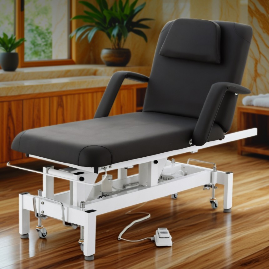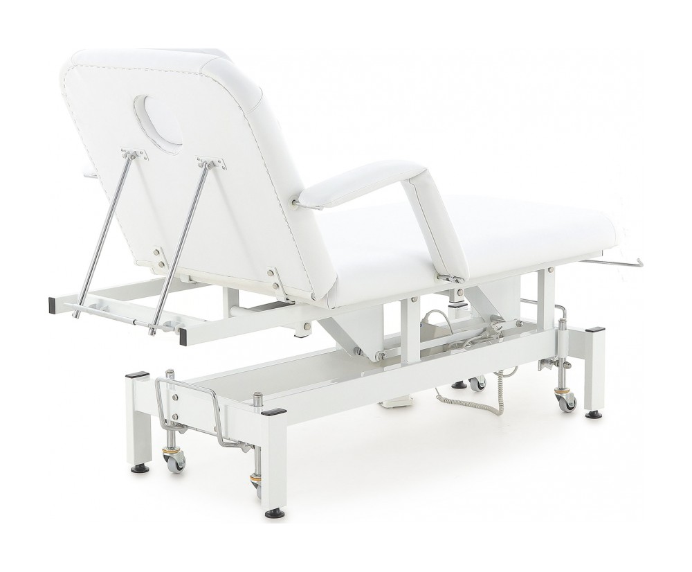 Данная модель сочетает в себе надёжную стальную конструкцию, удобное ложе из высококачественных материалов и простую регулировку ключевых параметров. Благодаря съёмным подлокотникам, газлифтовому механизму изменения угла спинной секции и ножному пульту управления высотой, стол обеспечивает комфорт клиентам и удобство специалистам в самых разных процедурах.