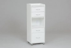 Косметологическая тележка TIKA изготовлена из практичного и прочного ЛДСП белого цвета. Изделие имеет четыре ящика различной высоты, что позволяет мастеру разместить инструменты и оборудование как малых, так и больших размеров. Верхняя полка оснащена бортиком, который предотвращает падение предметов при перемещении тележки.