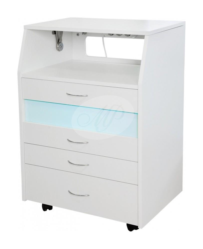 Тумба для кабинета педикюра и косметологии, изготовлена из ламинированного ДСП, с одной полкой и четырьмя выдвижными ящиками, одна из которых оснащена УФ-лампой мощностью 8 Ватт.