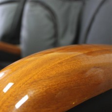 Респектабельность модели отдельно подчеркивает отделка под дерево подлокотников кресла. Черненные боковины и ярко красная стилевая полоса внизу придает дополнительную яркость.