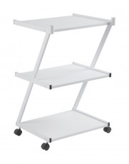 Столик для профессионального использования на металлическом каркасе белого цвета с тремя полками из ламинированного ДСП и отверстием для лампы-лупы. Подходит в кабинеты: косметологический, педикюрный, массажный и СПА процедур.